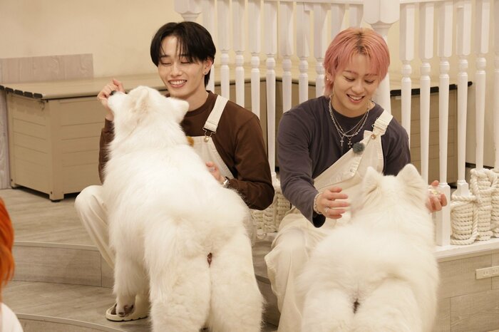 「マサ、ヤバい!」(シューヤさん)、「マーくんくらい脱力した状態でやらないと」(タカシさん)とほかのメンバーも驚きます。さらに「サモエドが大好き」だというユーキさんや、「気持ちいい…!」とゆっくりサモエドをなでるアロハさん、「ロケはもう終わりでいいね!」とリラックスしてサモエドと戯れるカイさんなど、超特急メンバー×サモエドの多幸感溢れるショットが続きます。