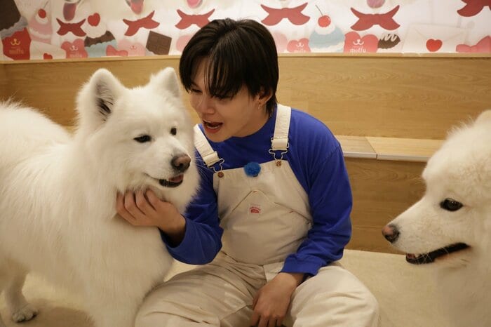 カフェに着くと、たくさんのサモエドたちが超特急をお出迎え。かわいいサモエドたちにメンバーのテンションが上がるなか、大型犬を飼った経験があるマサヒロさんは猛烈なスピード感でサモエドと仲良しに。