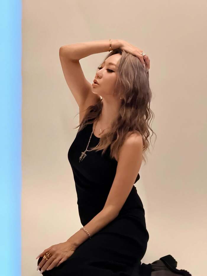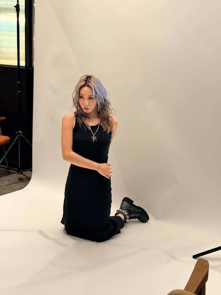 そこにはノースリーブのタイトなブラックワンピースに身を包み、白い背景で撮影に励む倖田さんの姿が。膝立ちをしたポージングで、唇を薄く開き、鋭い視線をカメラに向けています。