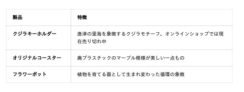 NPO法人 唐津Farm&Foodは、唐津市京町1783に位置する複合商業施設「KARAE(唐重)」内のコンセプトショップ「KARAE SHOP」にて、唐津の海岸や地域から集められた廃プラスチックをアップサイクルした製品3種の販売を開始しました。