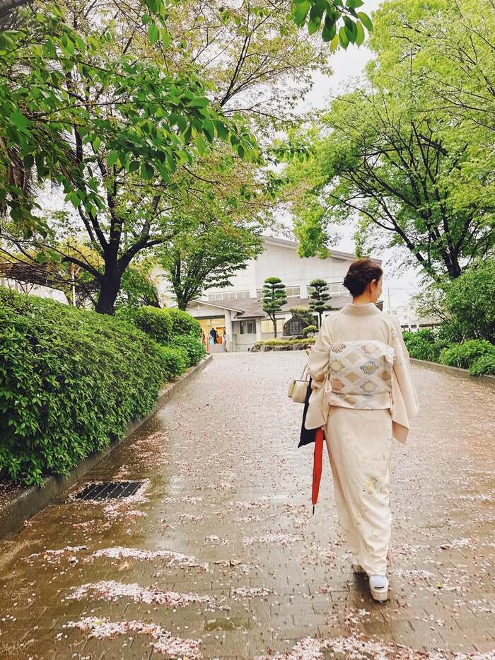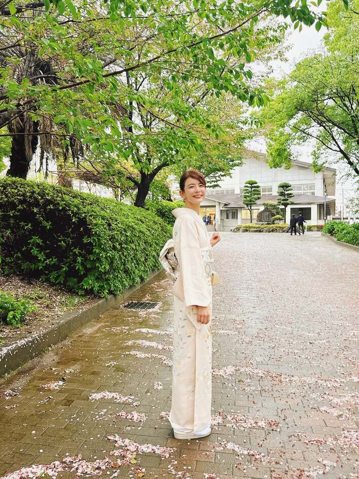 「優しい色合いの素敵なお着物は、卒業式の袴に続きお借りしました。お着物を着ると、やはり背筋が伸びます」と語る通り、ピシッとした姿勢がハレの日にぴったりですね。