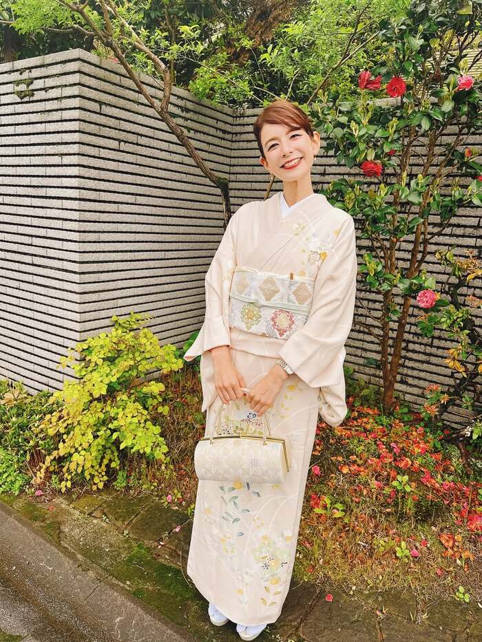 春の柔らかな光の中、淡く優しい色合いの着物を着こなすスザンヌさん。髪はすっきりとアップにまとめられ、母としての深い愛情がにじみ出たような、優しく包み込む眼差しと笑顔を見せています。