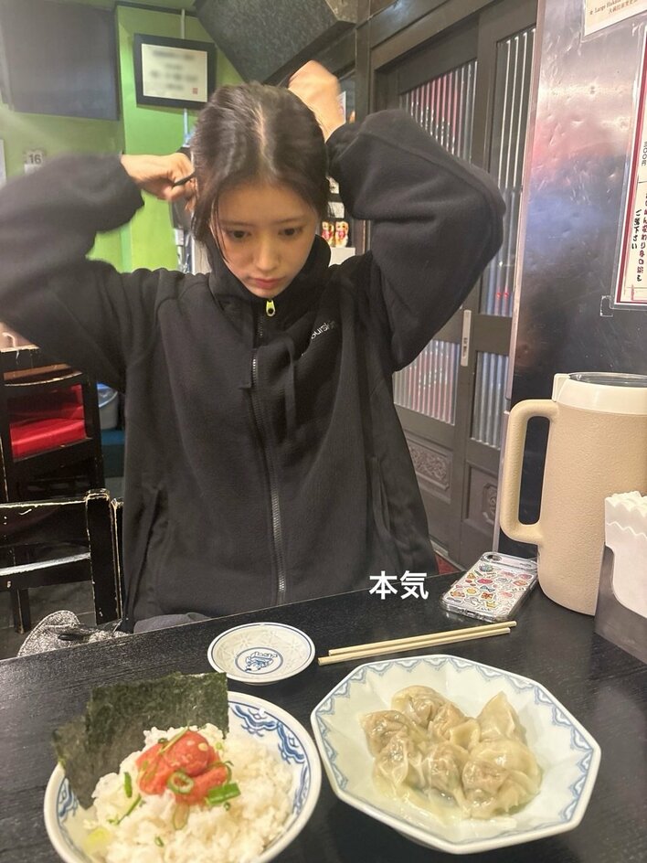 髪を結び直し、気合を入れたRIMAさんは、ここから本格的に食べ進めていく様子。写真には「本気」の文字も添えられており、食に対する並々ならぬ情熱が伝わってきます。