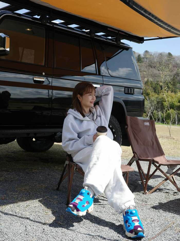 こちらは白のスウェットセットアップに、ビビットブルーのスニーカーを合わせた、遊び心あふれる大人のキャンプスタイル。手にはドリンクを持ち、リラックスした表情で遠くの景色を眺めています。