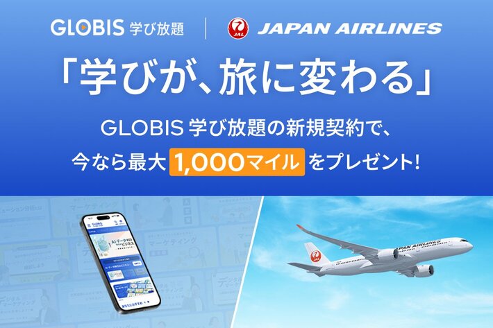 株式会社グロービス(本社:東京都千代田区、代表取締役:堀義人、以下 グロービス)が提供する定額制動画学習サービス「GLOBIS 学び放題」は、日本航空株式会社(本社:東京都品川区、代表取締役社長:鳥取三津子、以下 JAL)が運営するJAL会員向けマイル提携サービス「JALマイレージパーク」と連携を開始します。「GLOBIS 学び放題」の新規契約者を対象に、最大1,000マイルをプレゼントすることで、学び始めを応援するキャンペーンを開始しました。