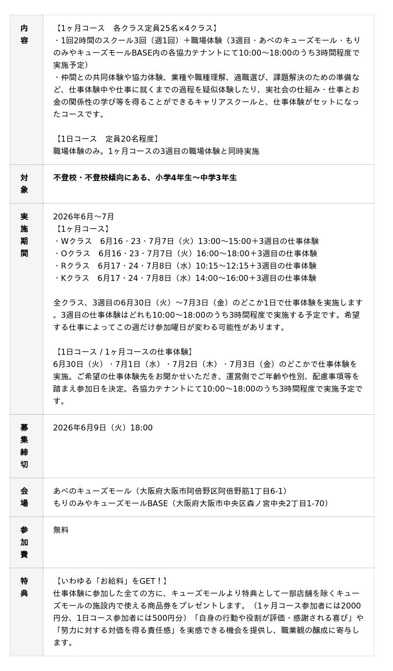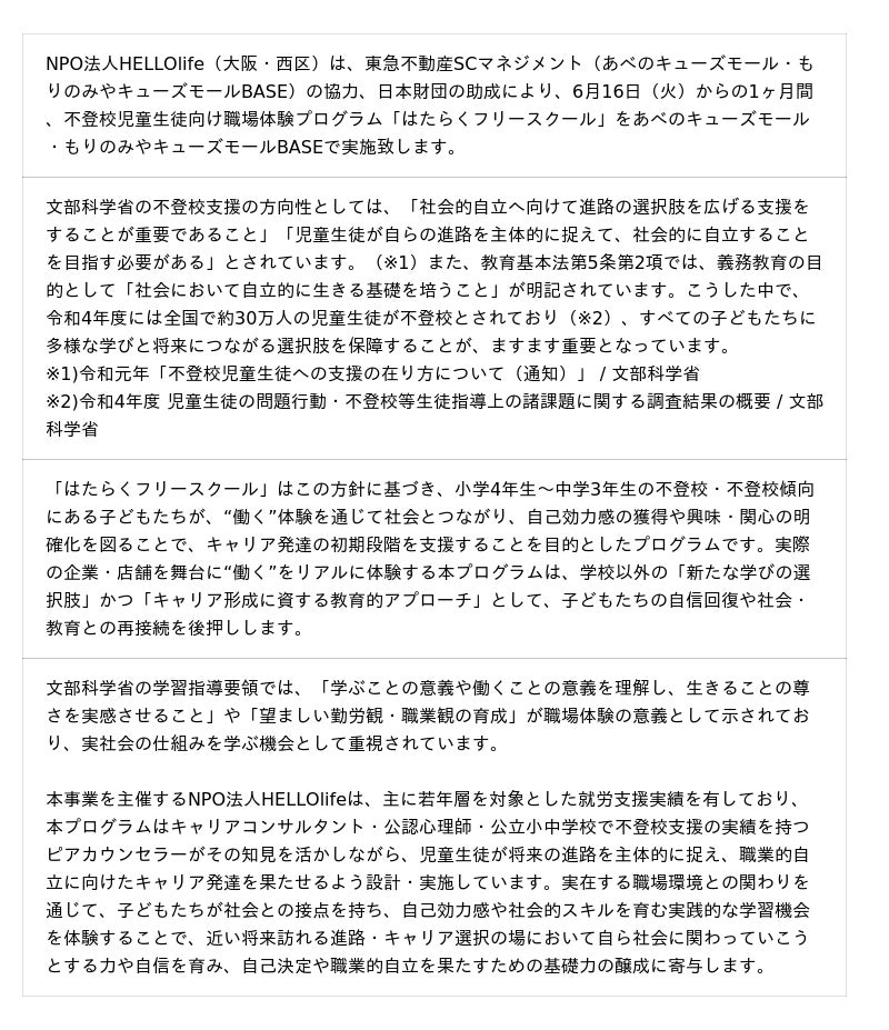 文部科学省の調査等でも、長期休暇明けや新学期など生活環境が大きく変化する時期には、子どもが学校に対する不安や“行きづらさ”を感じやすく、不登校に関する相談が増える傾向が指摘されています。報道関係者の皆様におかれましては、そういった時期にひとつの選択肢として本プロジェクトの存在を多くの方に届けるため、取材や記事掲載のご協力をお願い致します。