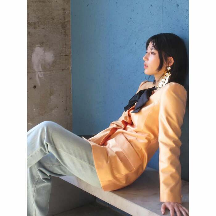 光沢感のある鮮やかなオレンジ色のジャケットに、ライトブルーのデニムパンツを合わせています。胸元のブラックリボンや、耳元で光る大振りのアクセサリーによって、バランス良くまとめられていますね。