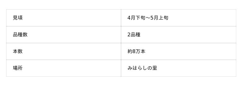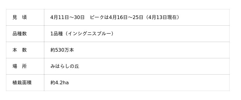 今年は平年より2日早い見頃となっております。今後は4月16日頃に満開となる見込みで、その後は25日頃まで、丘一面を彩る青の絶景をお楽しみいただける見通しです。