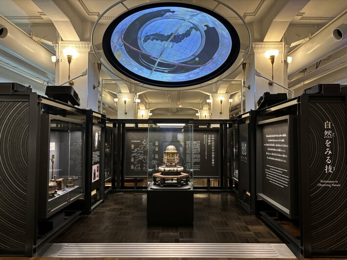 この展示室では、日本の四季や多様な自然に対する日本人の知的関心が自然科学へとつながることで生み出された独創性の高い道具や装置を展示しています。この度の展示改修では、近代の気象観測や測量に用いた機器を新たに追加するなど、日本人の科学と技術に関する活動の軌跡を辿る展示の充実を図りました。また、展示を再構成し、「日本の近代科学技術の幕開け 万年時計」、「天を知る」、「天地を読む」、「地を観る」、「気を記す」、「時を刻む」、「金属を生み出す」、「はかる」というコーナーに分けて紹介します。特に、地球館2階展示室から本展示室の導入部分に移設する万年時計については、時計に刻まれた盤面が、二十四節気、月齢等と連動する様を映像で補完することにより、その複雑な機構をより分かりやすくご覧いただけるようにしました。