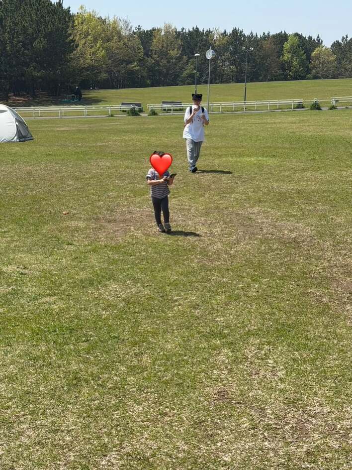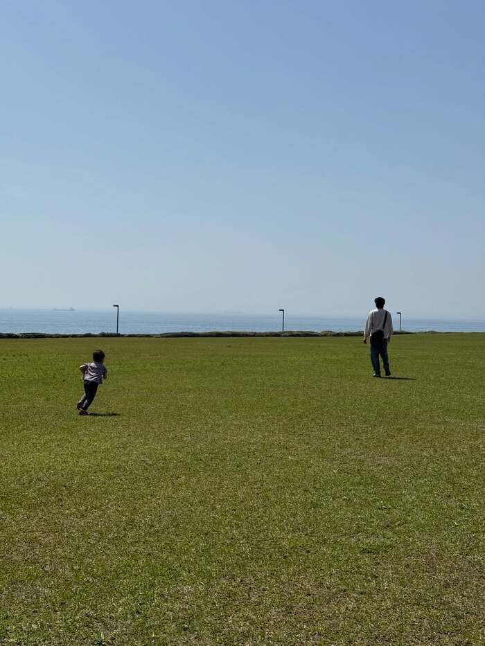 よく晴れた日だったようで、広々とした芝生のある場所を訪れた様子の丸山さん一家。