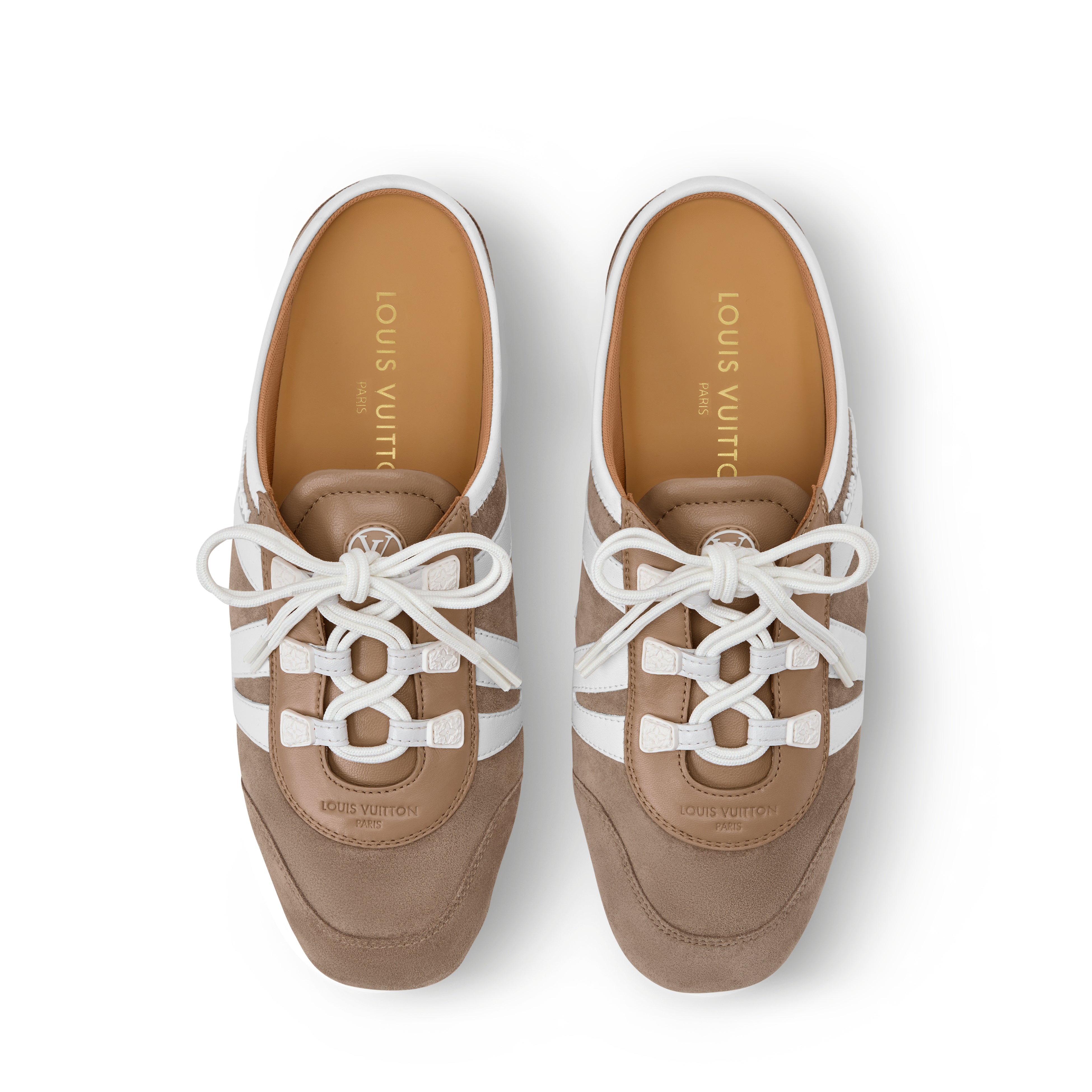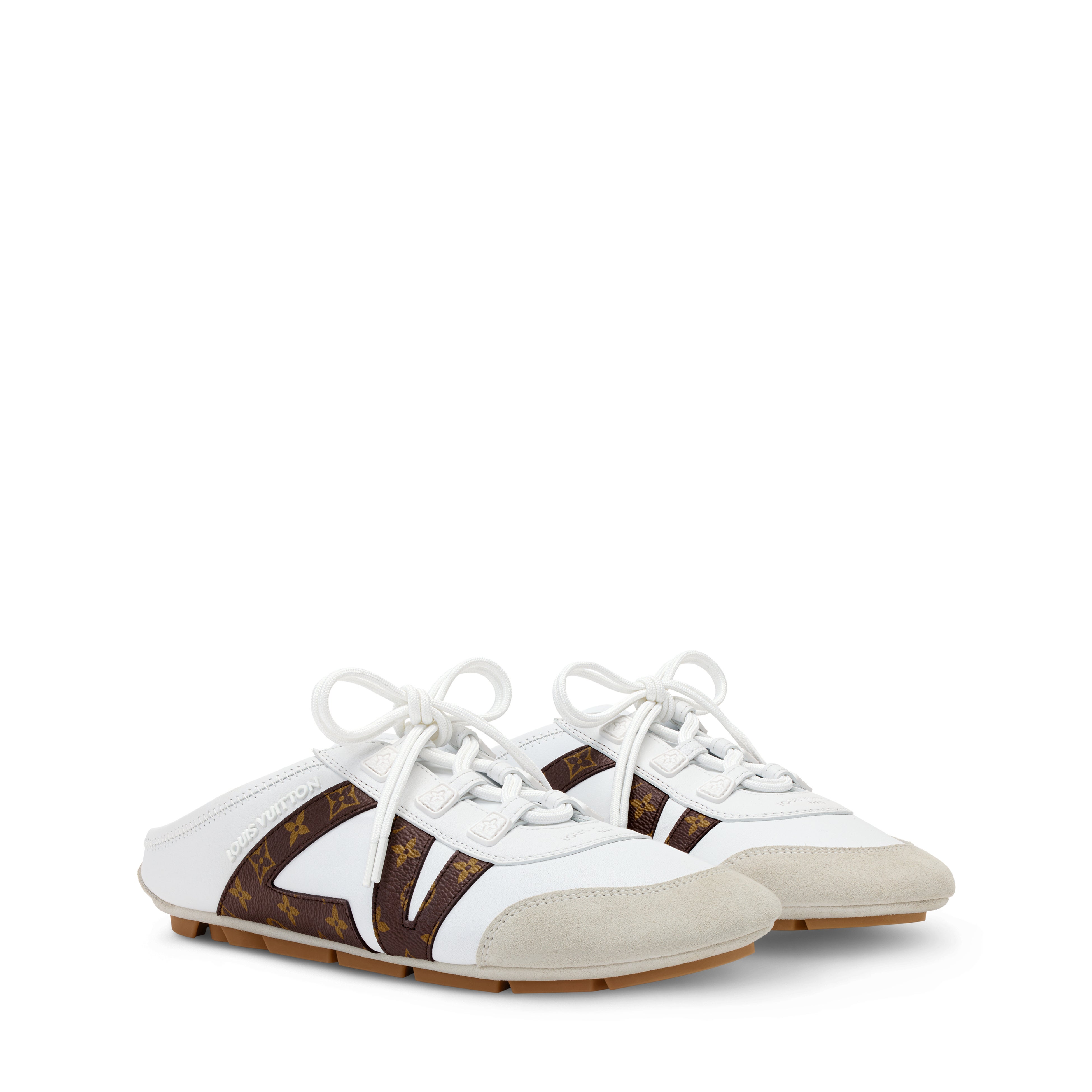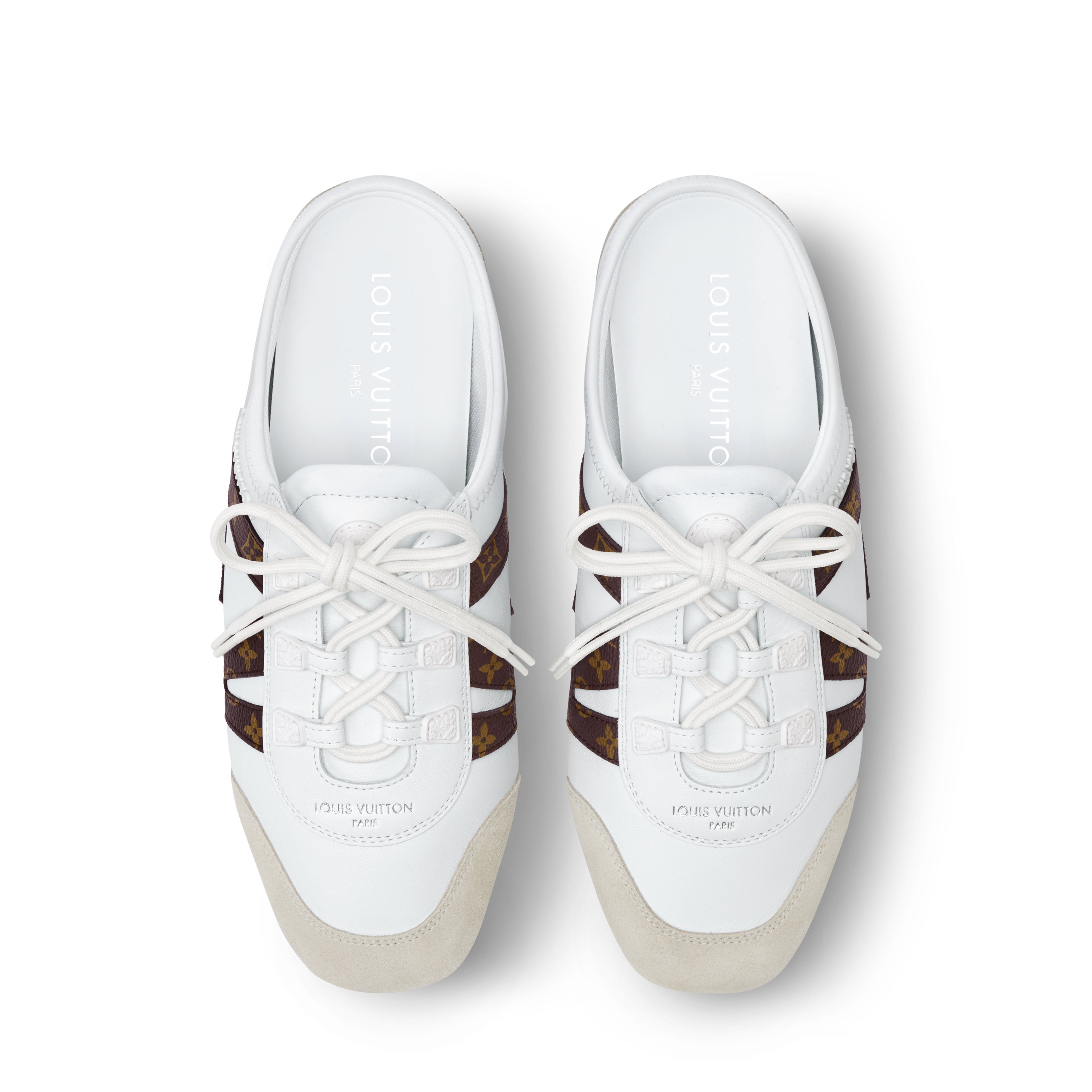 「LV スニーカリーナ」ラインにフレッシュなひねりを加えたオープンバックスタイルの「LV スニーカリーナ オープンバック」。アッパーには、この上なくしなやかなナッパレザーを使用し、サイドにはモノグラム・キャンバスのダイナミックなLV シグネチャーをあしらいました。着脱しやすいデザインに、サケット製法による構造とインジェクションTPUアウトソールを組み合わせ、優れた柔軟性と軽やかな履き心地を実現しています。
