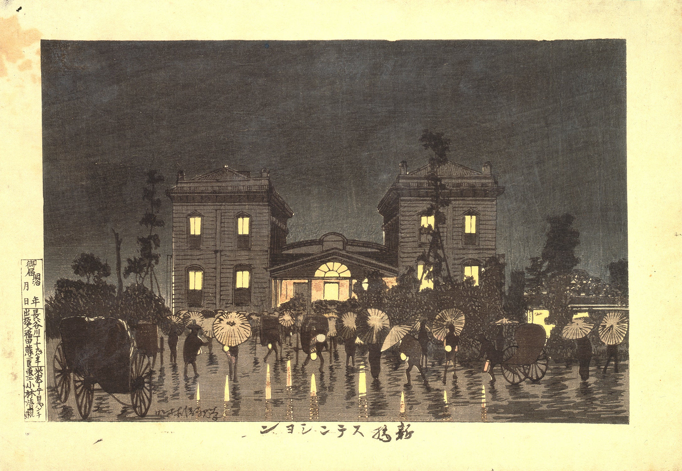 棟梁たちが見よう見まねで建てた擬洋風建築はどれも個性豊かなものでしたが、日本政府が求めていたのは個性よりも「本物の西洋」でした。欧米建築文化の摂取に努めるため、さまざまな国から技師や建築家が来日します。イギリス人のジョサイア・コンドル、ドイツ人のヘルマン・エンデ、ヴィルヘルム・ベックマンらがその代表です。彼らのつくりだす建物は、擬洋風建築とはひと味違う本格的なものとして、都市・東京の風景を壮麗に刷新していきました。闇夜に浮かぶ駅舎を「光線画」の画家・小林清親が詩情豊かに描いた