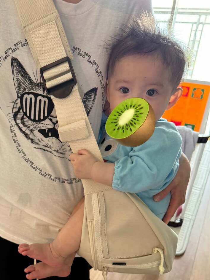 まずは、中川さんがかけた抱っこひもにちょこんとおさまっているショット。弟くんは、小さな体を中川さんにぴったりと寄せるようにくっつけ、ヒップシートに座っており、うるっとした大きな瞳でこちらを見つめています。