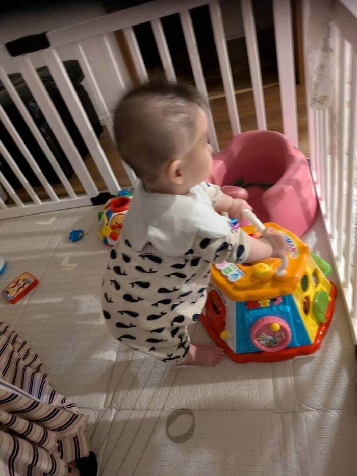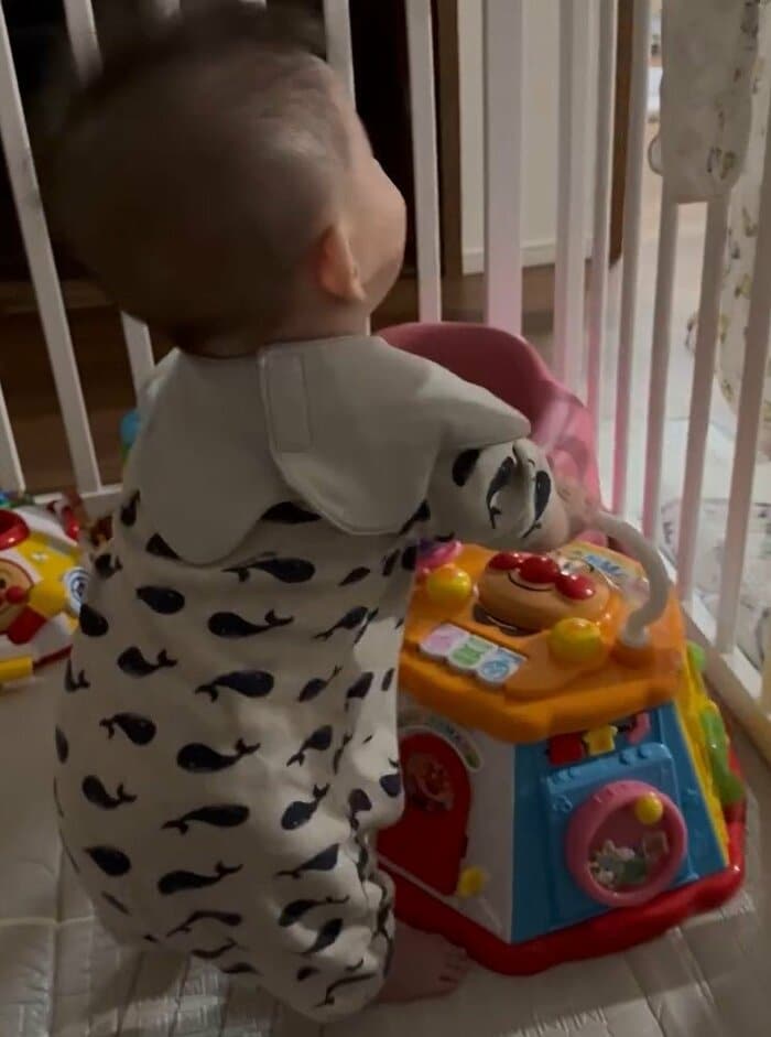 そして「な、なんと 弟くんがつかまり立ちしましたびっくり!」と報告し、おもちゃのボックスにつかまり、立ち上がっている姿も披露!