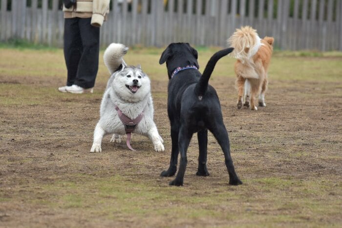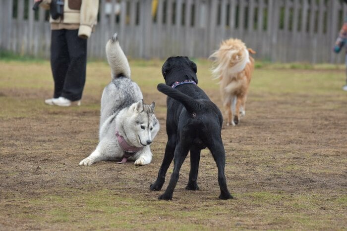 黒の大型犬を目の前に、お尻をプリッと持ち上げ、上半身を低くして前足で懸命に踏ん張る百福ちゃんの姿が!ふっさふさの尻尾が立っていて、どうやら相手を遊びに誘う“プレイバウ”のポーズをとっていた様子。