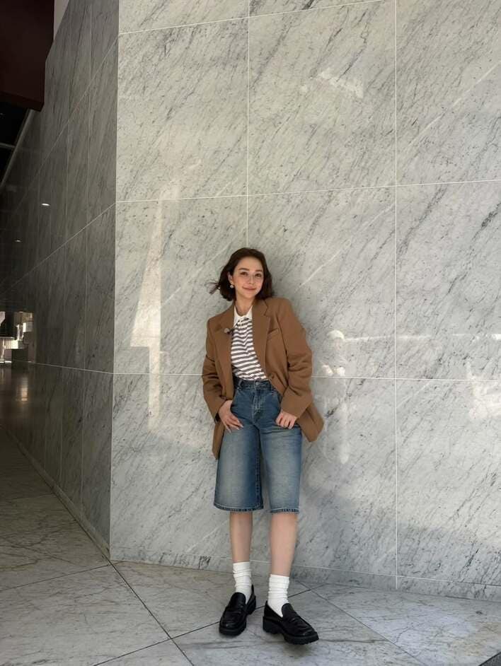 別の写真ではボーダーのトップスにデニムのハーフパンツを合わせた、ボーイッシュなスタイルも披露!