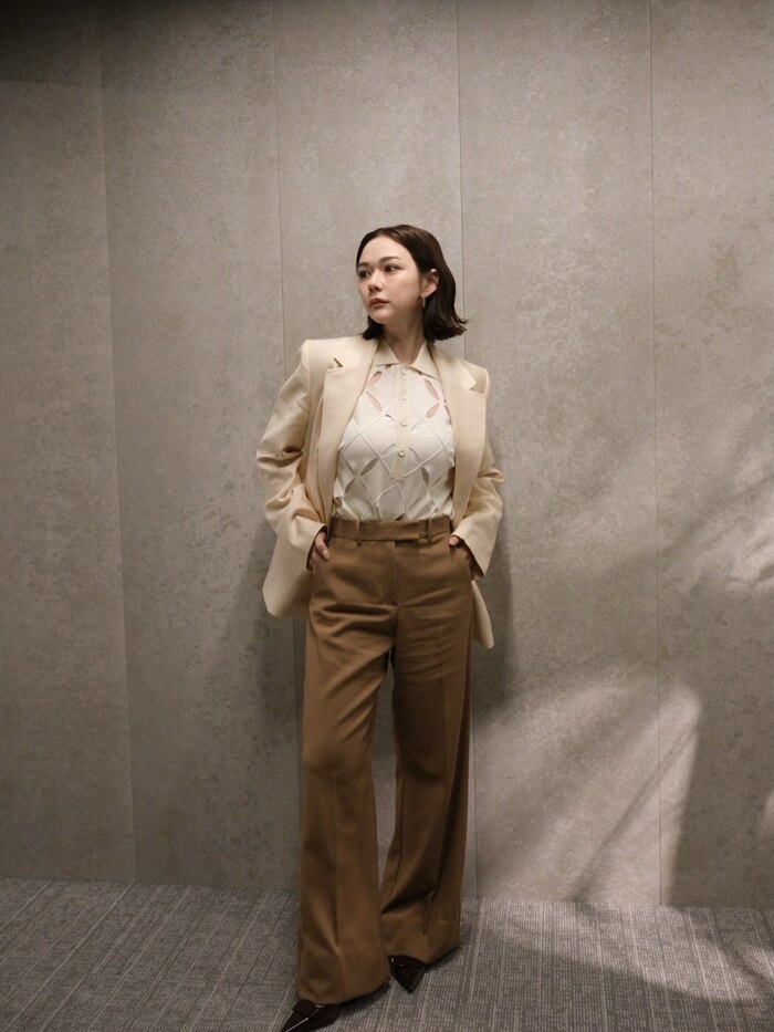 公開された写真には、透け感のある白いブラウスとブラウンのパンツにベージュのジャケットを合わせ、落ち着いた色味にトーンを合わせたコーディネートでたたずむ村重さんの姿が。