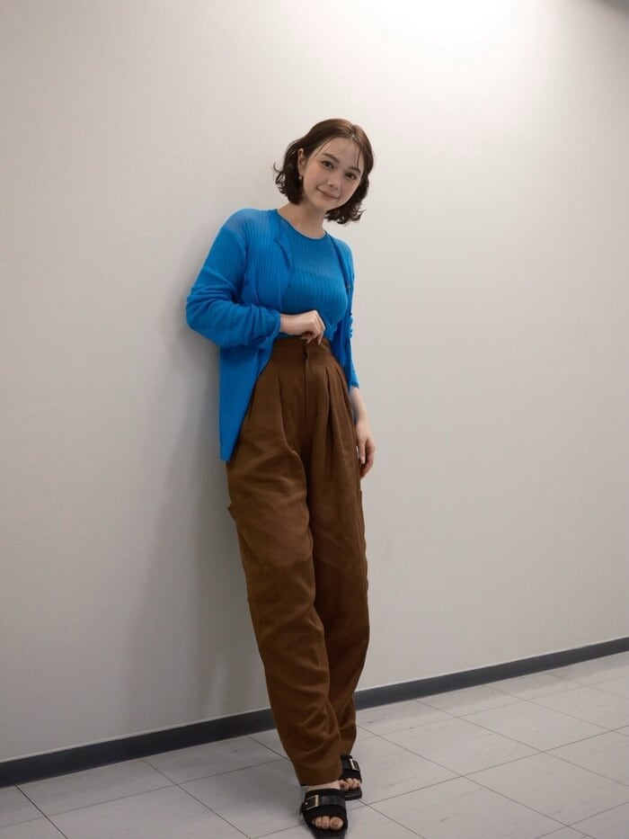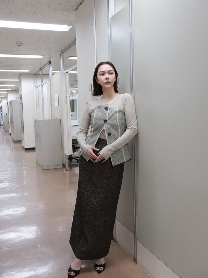 カーディガンにタイトスカートを合わせたスタイルで壁にもたれかかったポーズを決めるショットでは、先ほどの雰囲気とは少し変わり、大人の雰囲気が感じられる1枚になっています。