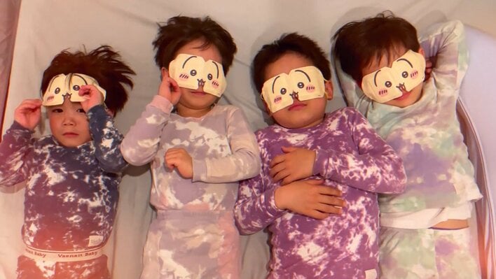 子どもたちが眠る様子を映した動画では、長男、次男、三男はスヤスヤと眠っているようですが、左の2歳の四男はアイマスクを上にあげ、ちらりとカメラを見つめています。そして、カメラと目が合うと・・