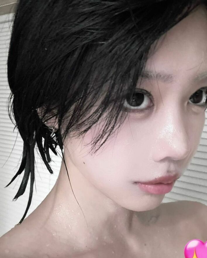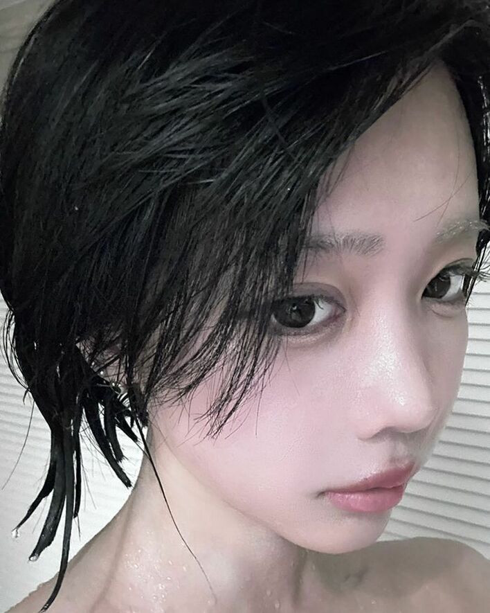 あのさんは「髪濡れただけで誰状態なれる」とコメントし、髪を濡らし、前髪をあげたダークな雰囲気のショットを公開しました。