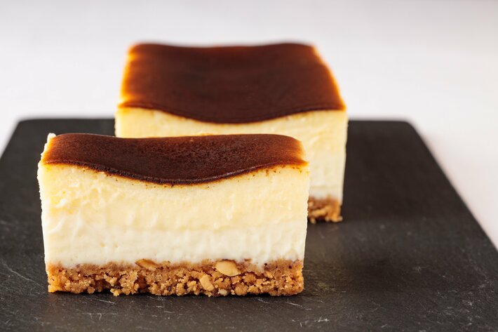 味わいの単調さ、チーズケーキでありながらチーズの存在感が希薄であること、卵のにおい、濃厚さゆえの重い食後感、食感の悪さ、そしてタルト生地が湿気ってしまう問題。これらすべてを個別に検証・解消し、香辛料やフルーツなどは一切用いず、正統派のチーズケーキとして「香ばしいチーズの風味」を主軸に構成しています。