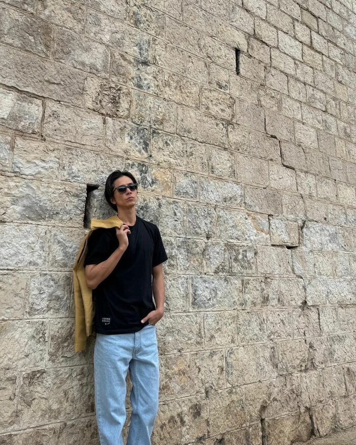黒いTシャツにジーパン、そしてサングラスをかけたシンプルな出で立ちが、オシャレな街並みに溶け込んでいます。