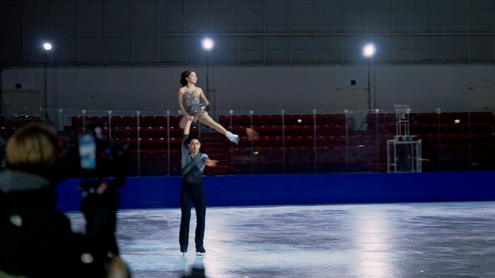 演技シーンの撮影前にはケガのないよう入念にウォーミングアップが行われ、リンクサイドでのウォーミングアップでは木原選手が三浦選手を持ち上げる様子も。