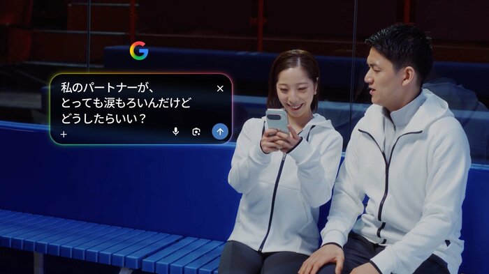 「検索なら、Google|りくりゅう『涙もろいパートナー』篇」は、リンクサイドに座った三浦選手が「私のパートナーが、とっても涙もろいんだけどどうしたらいい?」と Google検索のAIモードに質問しますが、三浦さんは「検索で出ないでしょ」と反応。