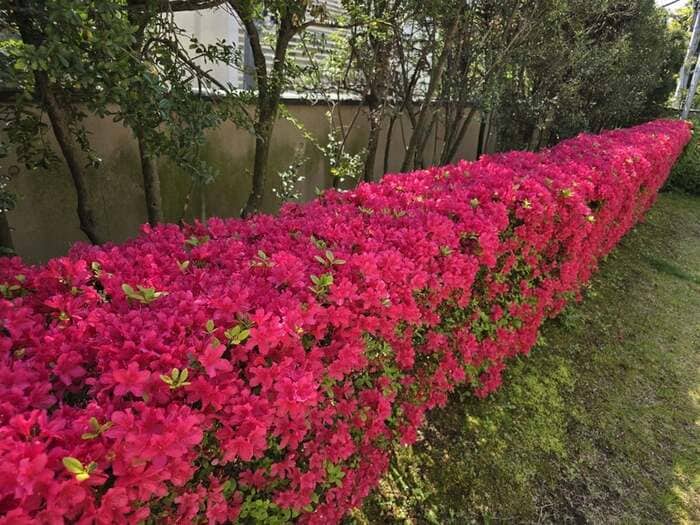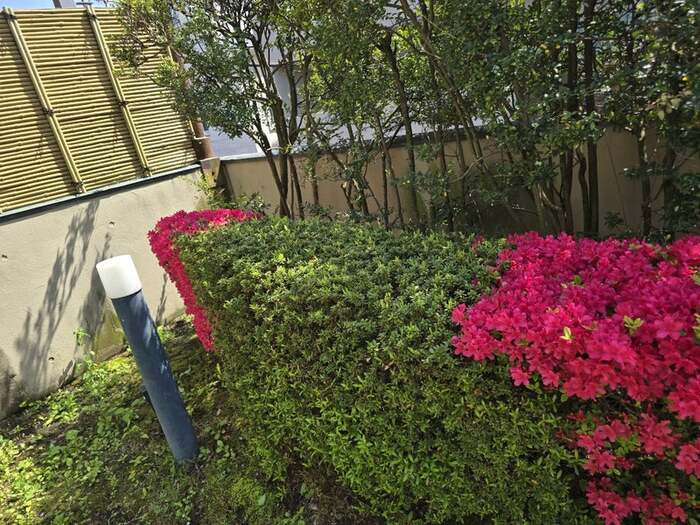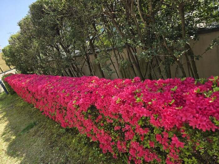 その写真を見てみると、青空が広がる中、少し高めの木々が並ぶ植え込みの手前には、鮮やかなピンク色に咲いたツツジがびっしり!形も綺麗に刈り込みされており、庭を華やかに彩っています。