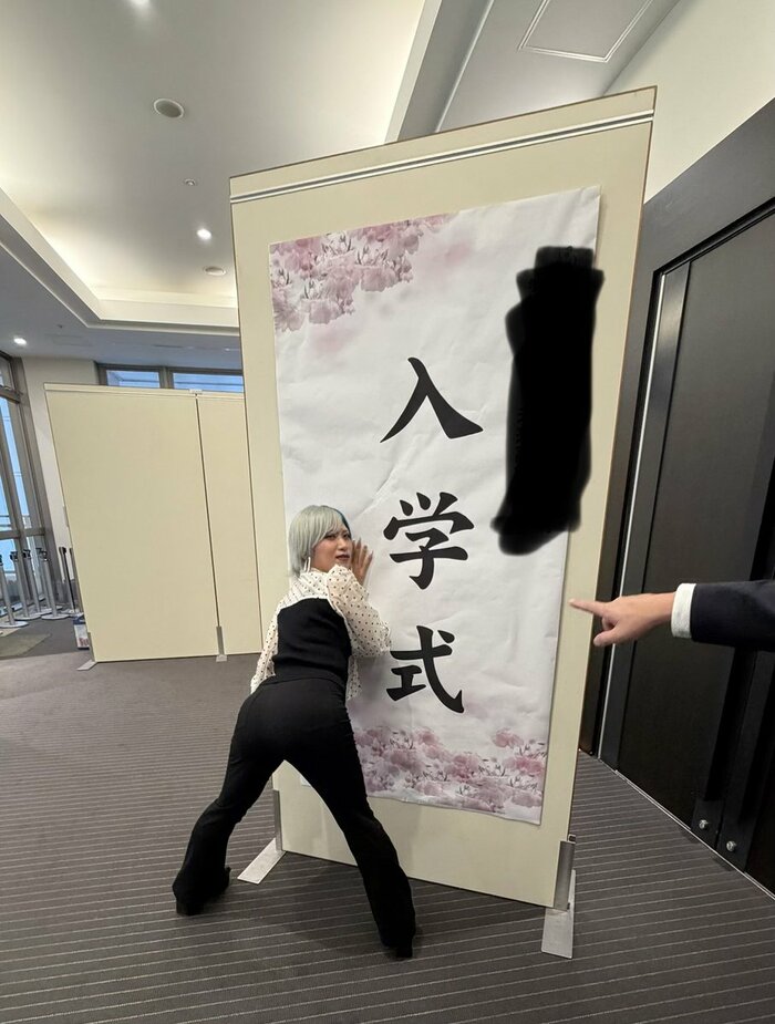 公開された写真には、桜で彩られた入学式のパネルをバックに、ピースサインをした手を高々とかかげる笑顔の信子さんの姿が。この日は、リボン付きのドット柄のブラウスと黒のタイトなビスチェが合わさったドッキングトップスに黒のパンツを合わせた、上品なコーデになっています。