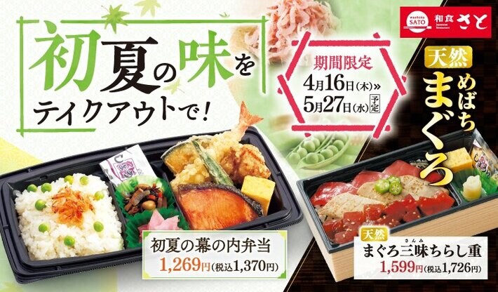 国内201店舗を展開する「和食さと」では、2026年4月16日(木)から期間限定でお持ち帰りメニュー「初夏の旬をテイクアウト」を販売いたします。今日は少し豪華なおうちごはんが食べたいという日や、行楽のお供にもぴったり。ぜひこの機会に和食さとのテイクアウトメニューをお楽しみください。和食さと お持ち帰り「初夏の味をテイクアウトで!」のおすすめポイント!