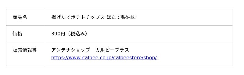 カルビー株式会社(本社:東京都千代田区、代表取締役社長兼CEO:江原 信)は、アンテナショップ「カルビープラス 新千歳空港店」にて、揚げたて商品であるポテトチップスの新しいラインアップとして『揚げたてポテトチップス ほたて醤油味』を2026年4月15日(火)から発売します。
