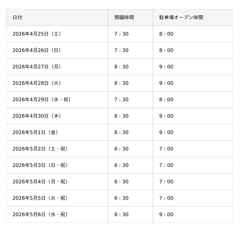 ※天候等の状況により、駐車場オープン、開園時間は変更になる場合があります。