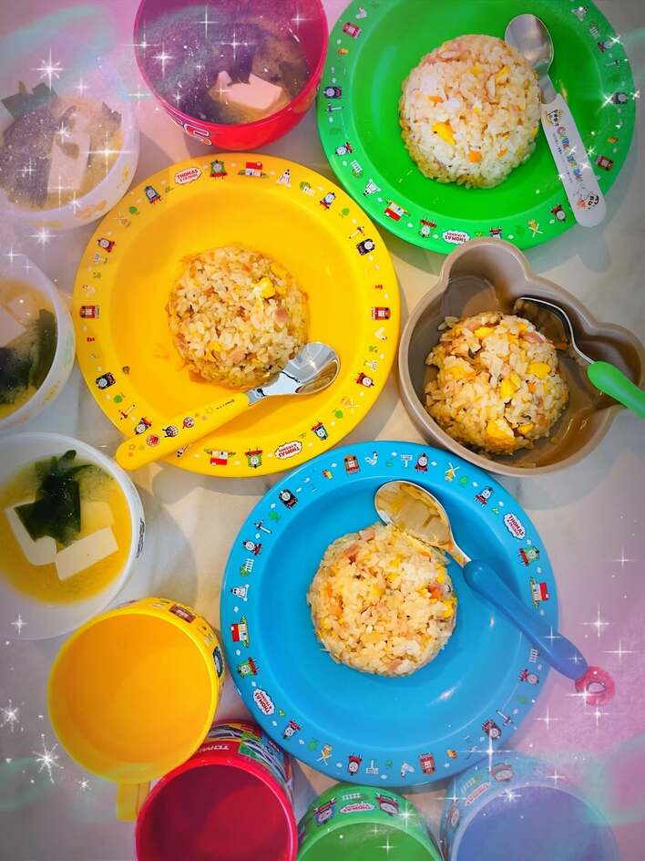 公開された写真には、テーブルにカラフルなお皿に盛られたチャーハンと、みそ汁が4人分並べられています。