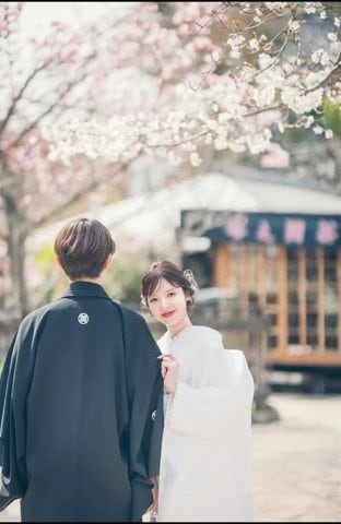 撮影は、桜が満開の時期に行われたそうで、桜の木のもとで和装姿の夫と向かい合いながら、両手をつないだ仲むつまじさあふれるカットや…