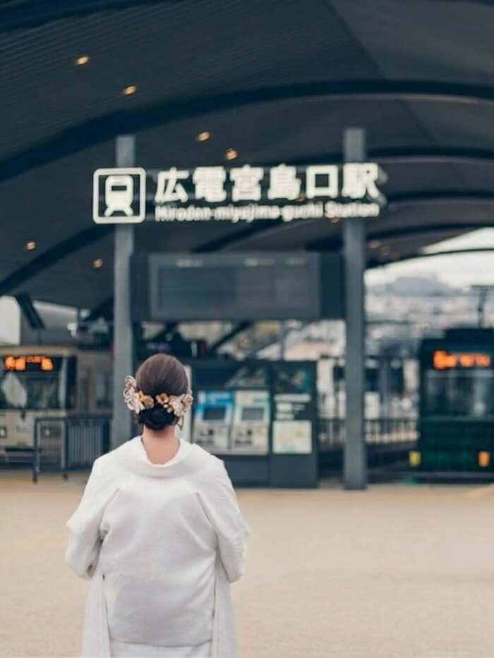 今回、前撮り撮影のために地元・広島の宮島を訪れたようで、「広電宮島口駅」を見つめる後ろ姿は純白の白無垢に、お花をあしらったような髪飾りが華やかです。