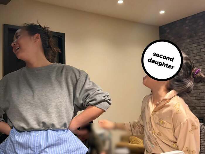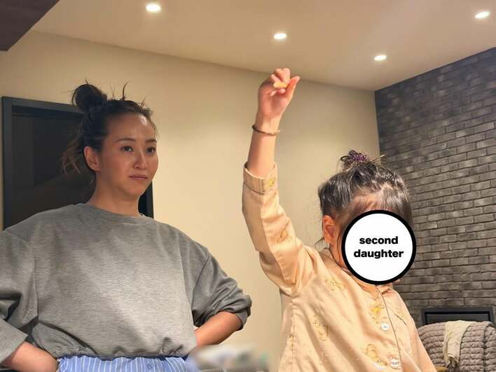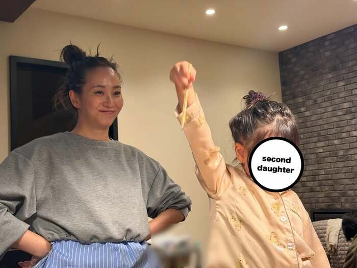 そこには、筆記用具を持つ手を大きく上にあげている次女と、その後ろで両手を腰に当て真剣な表情をした藤本さんの姿が。藤本さんは口元をきゅっと引き締め、一切の笑みを浮かべず、まっすぐ前を見つめていて、庄司さんは「空に書きなさいって 書かされてる」と次女が藤本さんの指導のもと、空中で手を動かして字を書く練習をしていることを明かしました。
