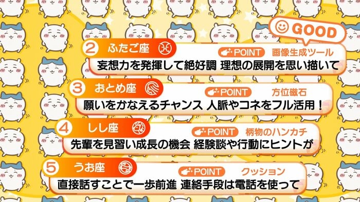 『めざましテレビ』で放送中の「ちいかわ占い」 テレビ放送がない日はお休みで、月~土:朝7時以降に更新予定です。