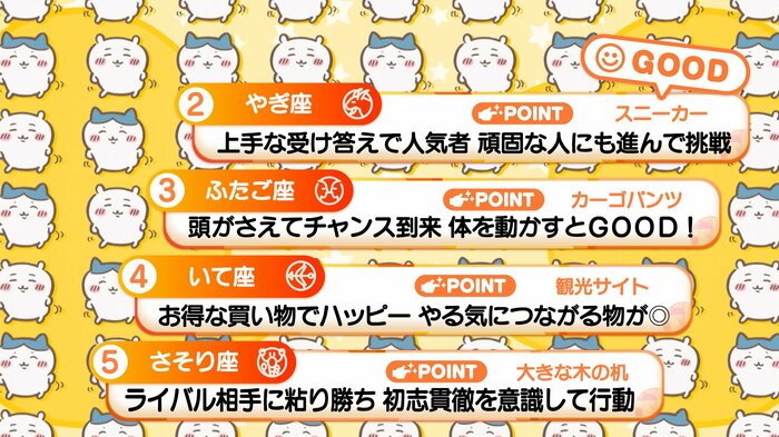 『めざましテレビ』で放送中の「ちいかわ占い」 テレビ放送がない日はお休みで、月~土:朝7時以降に更新予定です。
