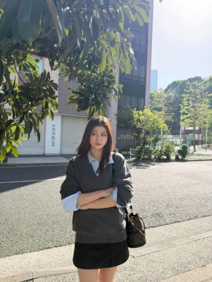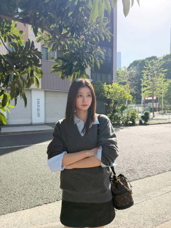 公開された1枚目の写真には、街中でブルーのシャツにグレーのニットを合わせ、ミニ丈のボトムスをはいたコーデを披露。