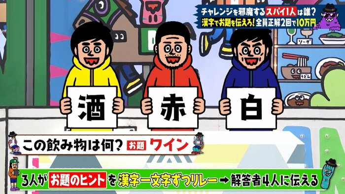 3人の伝達者がお題に対してヒントとなる漢字一文字を、1人ずつリレー形式で提示し、そこから4人の回答者が正解を導き出します。