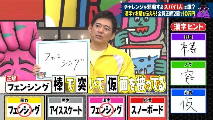 野呂さんの漢字を「棒」だと認識した華丸さんは「『棒』で『突』いて『仮』面を被ってる」と推測。山内さんも「『面』だと剣道もあるから、『仮』面の方を書いた?」と推測したとコメント。