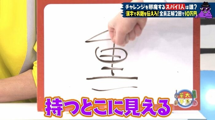 大悟さんが書いた文字をよく見ると、「重」の下に一本の横線が書かれていて、布にアイロン当てている様子にも見えて、濱家さんから「『象形文字ダメ』って言ったのに。持つところに見えるし!」とツッコミが。