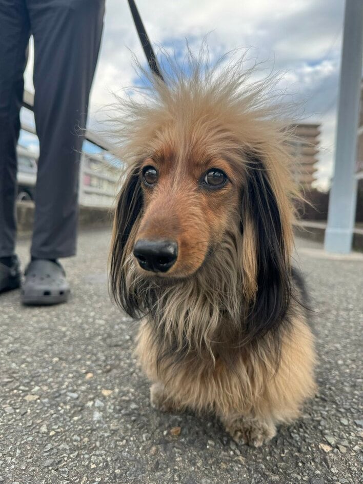 頭頂部の毛がフワフワで長い、まるで“モヒカン”のような見た目でキリッとした表情を浮かべているのは、3歳のミニチュア・ダックスフンド「おこげ」くん。