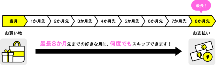 「スキップ払い」は、ショッピング1回払いのお支払月を、本来のお支払月から最長8か月先まで変更できる支払方法です。一度お申し込みいただいた後も、本来の支払月から最長8か月先までの範囲であれば、何度でも支払月の変更が可能です。