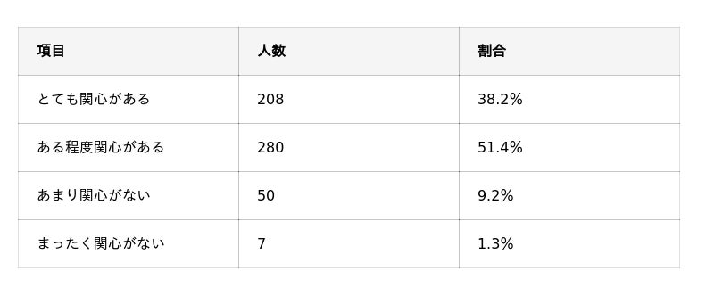 本調査の結果から、サステナビリティや社会課題に対する関心は、学生の間で非常に高い水準にあることが明らかになりました。「とても関心がある」(38.2%)と「ある程度関心がある」(51.4%)を合わせると、約9割(89.5%)が関心を持っていることがわかりました(表1)。特に、「とても関心がある」と回答した学生が約4割にのぼる点は、単なる認知にとどまらず、主体的な関心を持つ層が一定数存在していることを示しています。一方で、「まったく関心がない」は1.3%にとどまり、サステナビリティが多くの学生にとって身近なテーマとなっている様子がうかがえます。