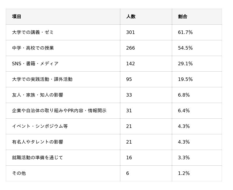 さらに、「友人・家族の影響」(6.8%)や「企業・自治体の情報発信」(6.4%)、「就職活動を通じて」(3.3%)といった項目はいずれも低水準にとどまりました。特に企業や社会との接点が関心形成に十分寄与していない点は、産学連携や情報発信の在り方に課題があることを示唆しています。