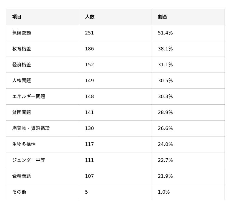また、学生が関心を寄せるサステナビリティのテーマは、気候変動や教育格差、経済格差など多岐にわたり、環境問題にとどまらず、社会課題全体へと関心が広がっていることがわかりました。「気候変動」(51.4%)は半数を超え、最も関心の高いテーマとなっています(表3)。表3:特に関心のあるイシュー(複数回答可)n=488