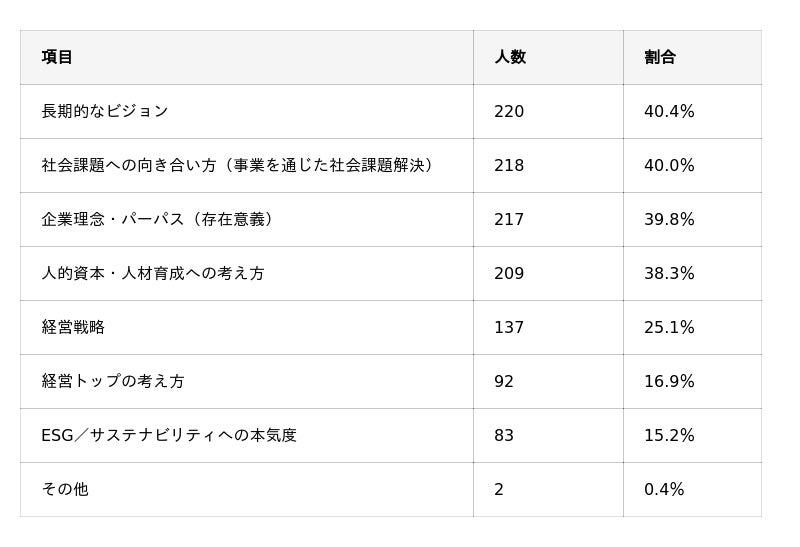 また、学生が就職先を選ぶ際には、仕事内容や待遇だけでなく、企業の考え方や姿勢といった“本質的な価値”を重視していることが明らかになりました。就職先を検討する際に、仕事内容や待遇以外で志望動機となり得る要素としては、「長期的なビジョン」(40.4%)、「社会課題への向き合い方(事業を通じた社会課題解決)」(40.0%)、「企業理念・パーパス(存在意義)」(39.8%)、「人的資本・人材育成への考え方」(38.3%)と、いずれも約4割と高水準で並んでおり、企業の考え方や姿勢に関わる項目が志望動機の要素として広く認識されていることがうかがえます(表5)。表5:仕事内容や待遇以外で、志望動機になり得ると感じる要素(複数選択可)n=545