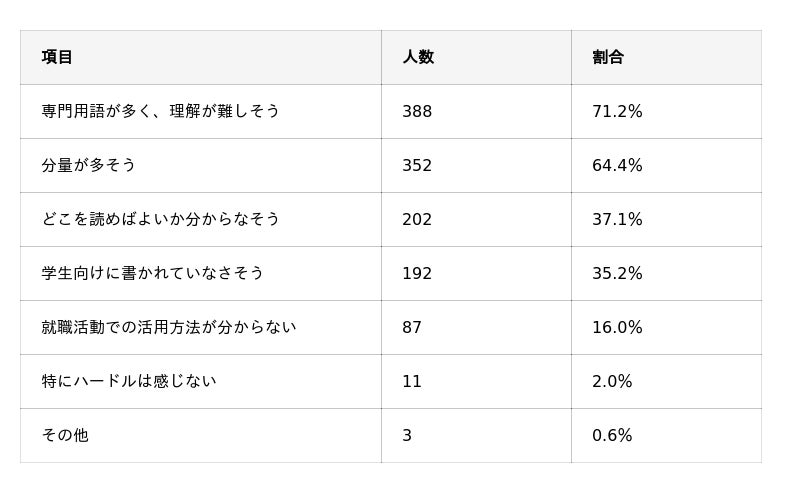 「就職活動や企業研究の中で、企業の「統合報告書」を読んでみたいと思いますか」という問いに対しては、「ぜひ読んでみたい」(28.6%)と、「機会があれば読んでみたい」(52.8%)を合わせると、約8割(81.5%)の学生が関心を示しました。一方で、統合報告書を読むうえで難しそう・ハードルに感じる点としては、「専門用語が多く理解が難しそう」(71.2%)や、「分量が多そう」(64.6%)が多く、さらに、「どこを読めばよいか分からなそう」が(37.1%)、「学生向けに書かれていなさそう」(35.2%)と続いており、読み方や対象読者との距離に関する課題も認識されていることがうかがえます。(表6)